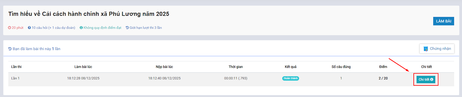 Sau khi đã làm bài xong, nhấn vào mục chi tiết để xem bài thi của mình.