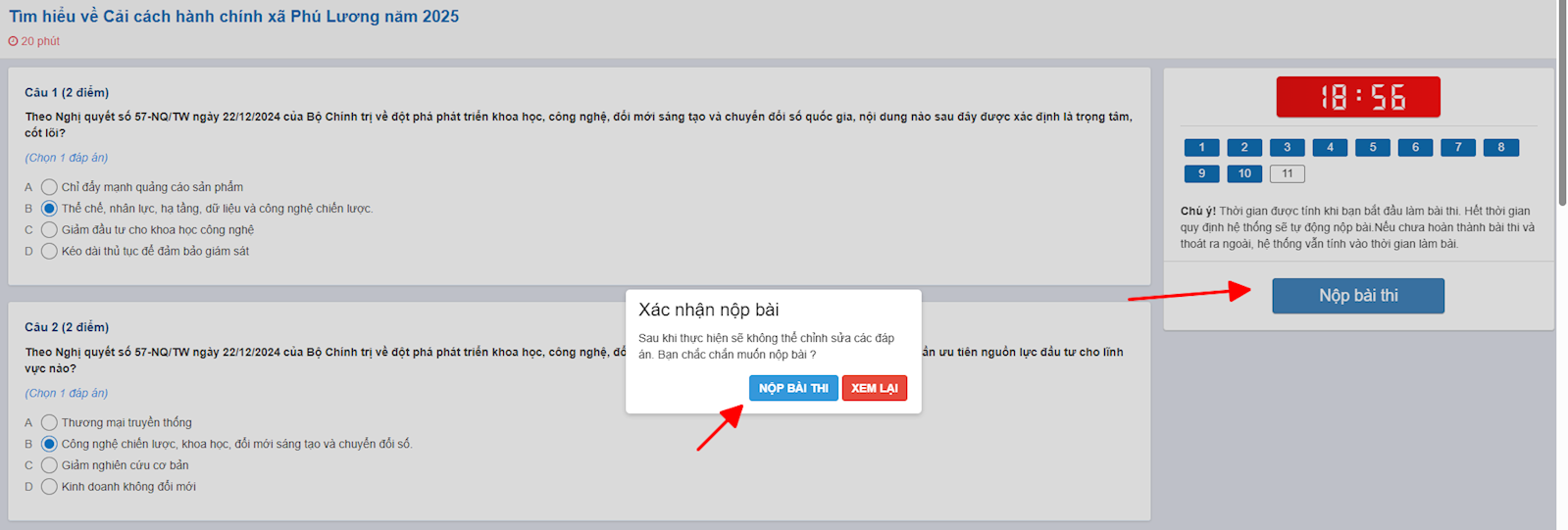 Thí sinh tích chọn vào đáp án mà mình cho là đúng để trả lời. Khi trả lời xong tất cả các câu hỏi, thí sinh nhất nộp bài để trả lời thêm câu hỏi phụ.